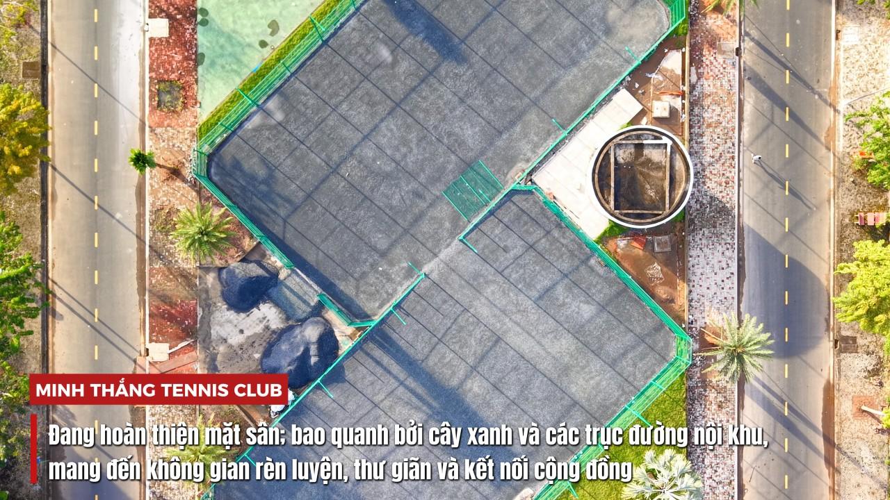 - ️Minh Thắng Tennis Club: Hoàn thiện mặt sân, bao quanh bởi mảng xanh và hệ thống cảnh quan nội khu.